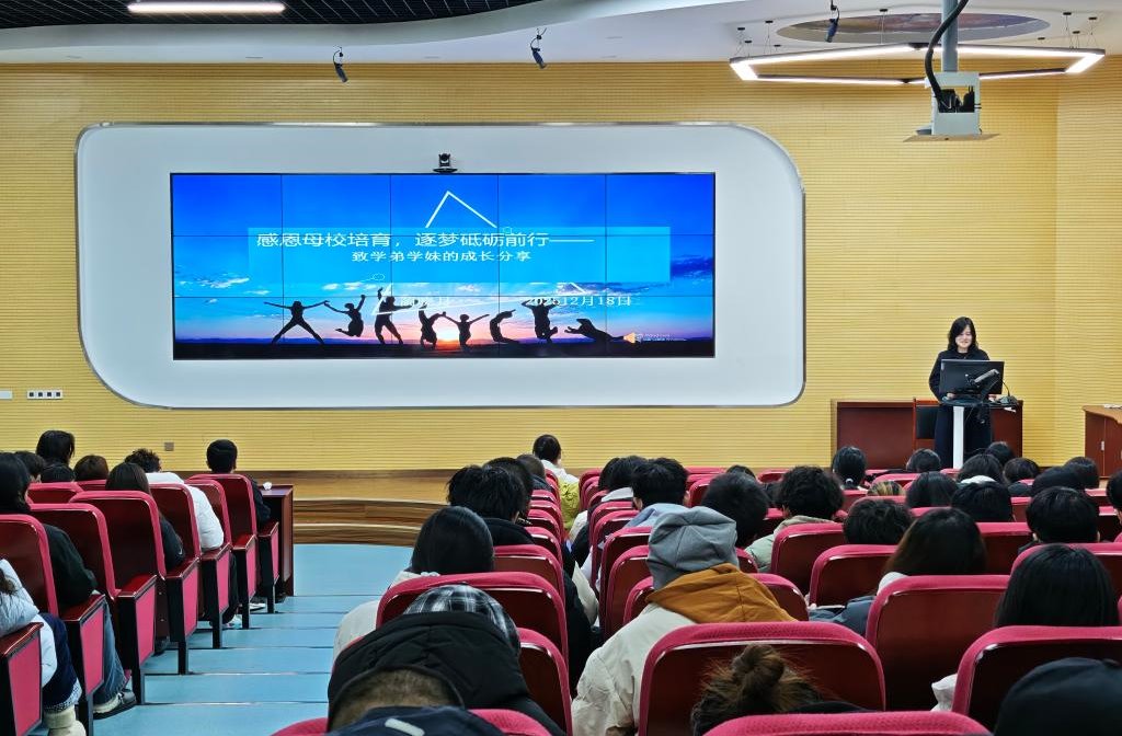 2025年12月18日,动物医学院在南校区二号教学楼智慧教室开展优秀校友职业发展分享会。目前就职于山东省畜牧兽医局的2001级校友张文娟、2004级校友蔺晓月重返母校,分别以《行而不辍,以梦为马:牧院学子与畜牧业的未来》和《感恩母校培育,逐梦砥砺前行——致学弟学妹的成长分享》为题,分享了她们的职业感悟。动物医学院200余名师生参加。