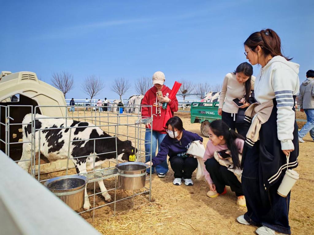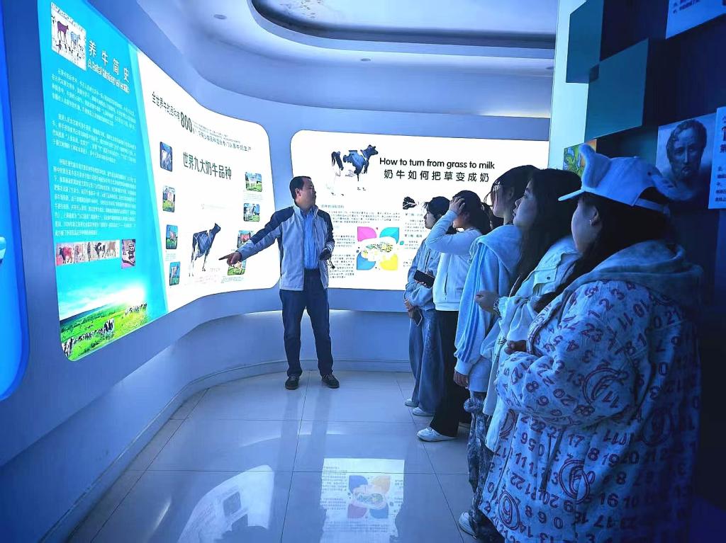 同学们抵达示范园后,首先举行了开班仪式并开展安全教育,明确了劳动日程与实践要求,强化了劳动风险防范意识,为实践活动筑牢安全防线。实践过程中,在合力牧业奶牛科普馆,同学们观看牧场发展视频、参观科普展厅,学习奶业发展历史、酸奶营养知识以及奶牛身体构造、产奶流程等专业内容;在亲子农场区,大家近距离观察牦牛、和牛等畜禽的生物学特性;此外,同学们还走进欧力菲德(山东)饲料科技有限公司及肉牛养殖有限公司,开展饲料生产加工、肉牛饲养管理、消毒防疫等见习实训,将课堂理论知识与产业实际应用紧密结合。